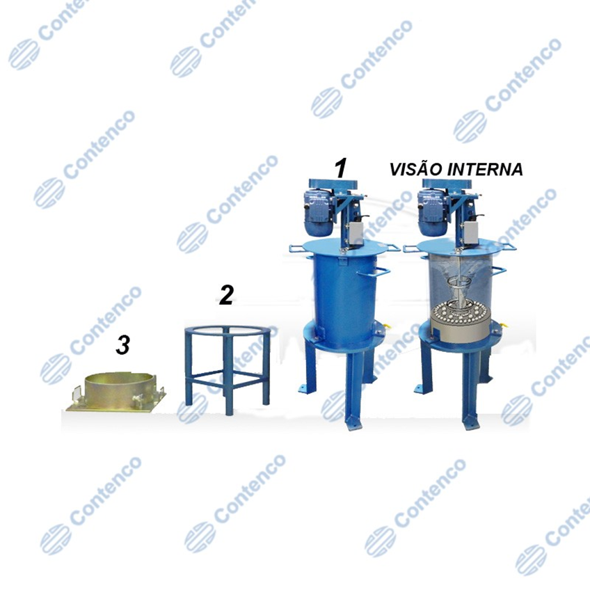 Compõe-se de recipiente e hélice em aço Inoxidável. Á água em movimento espiral, com carga de esferas também de aço inoxidável, produzem a abrasão no concreto. Acompanham 70 esferas de aço inoxidável e sem emendas, sendo: 25 de Ø 12,7mm; 35 de Ø 19,05mm e 10 de Ø 25,4 mm. Dimensões aprox. (ALP) 1220x533x533 mm
