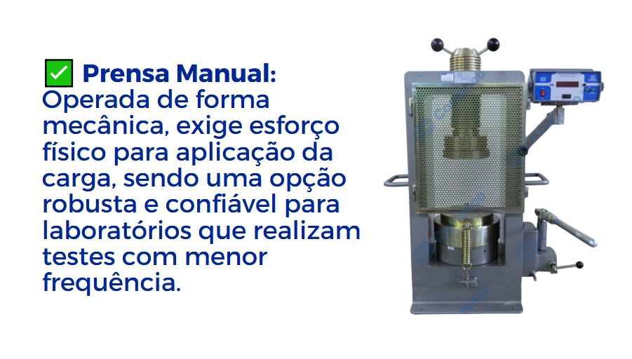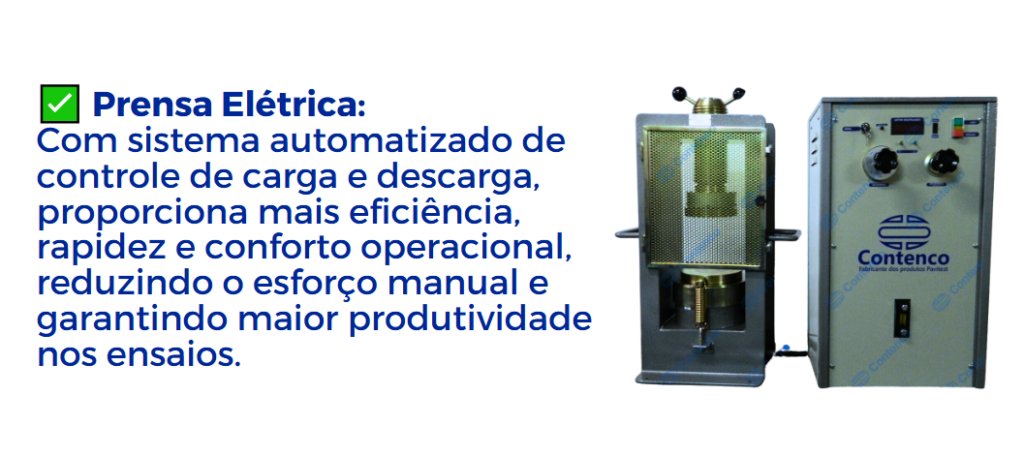 Os ensaios utilizam prensas hidráulicas específicas, como as oferecidas pela Contenco/Pavitest. Esses equipamentos estão disponíveis nos modelos elétrico e manual, com tecnologia de ponta e fabricação 100% nacional. Conheça algumas opções: