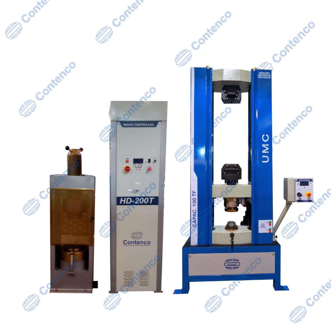 | Máquina Universal de Ensaios, com capacidade máxima de 100.000 Kgf (1.000 kN), eletromecânica, microprocessada, autocarregável, tipo: Bifuso autoportante, com duas colunas guias cilíndricas paralelas: