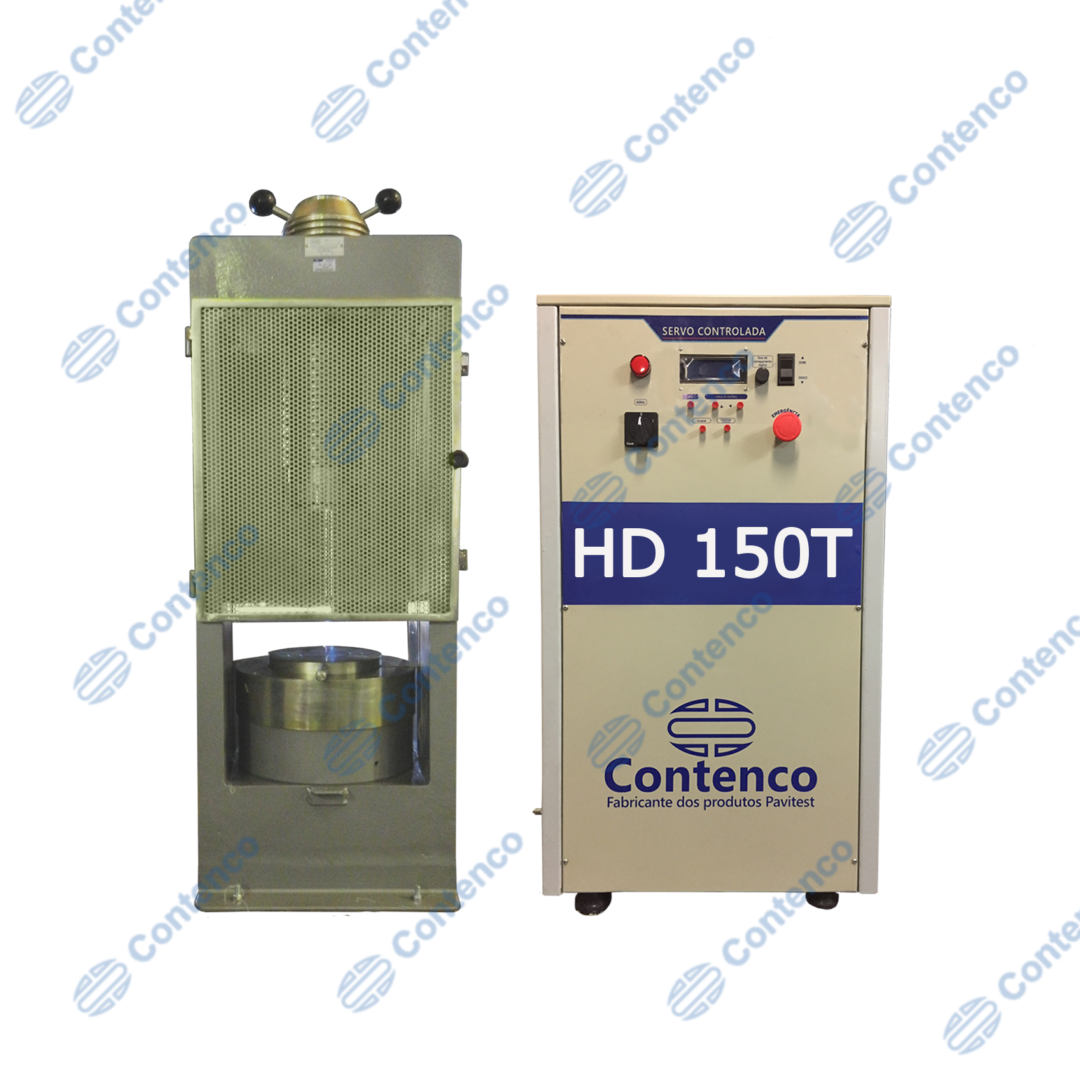 Prensa servo-controlada, 150 Tf, com acionamento hidráulico/eletrônico micro-processado, para ensaios de compressão axial em corpos de prova de concreto, diâmetro de 10×20 cm e diâmetro de 15 x 30 cm.